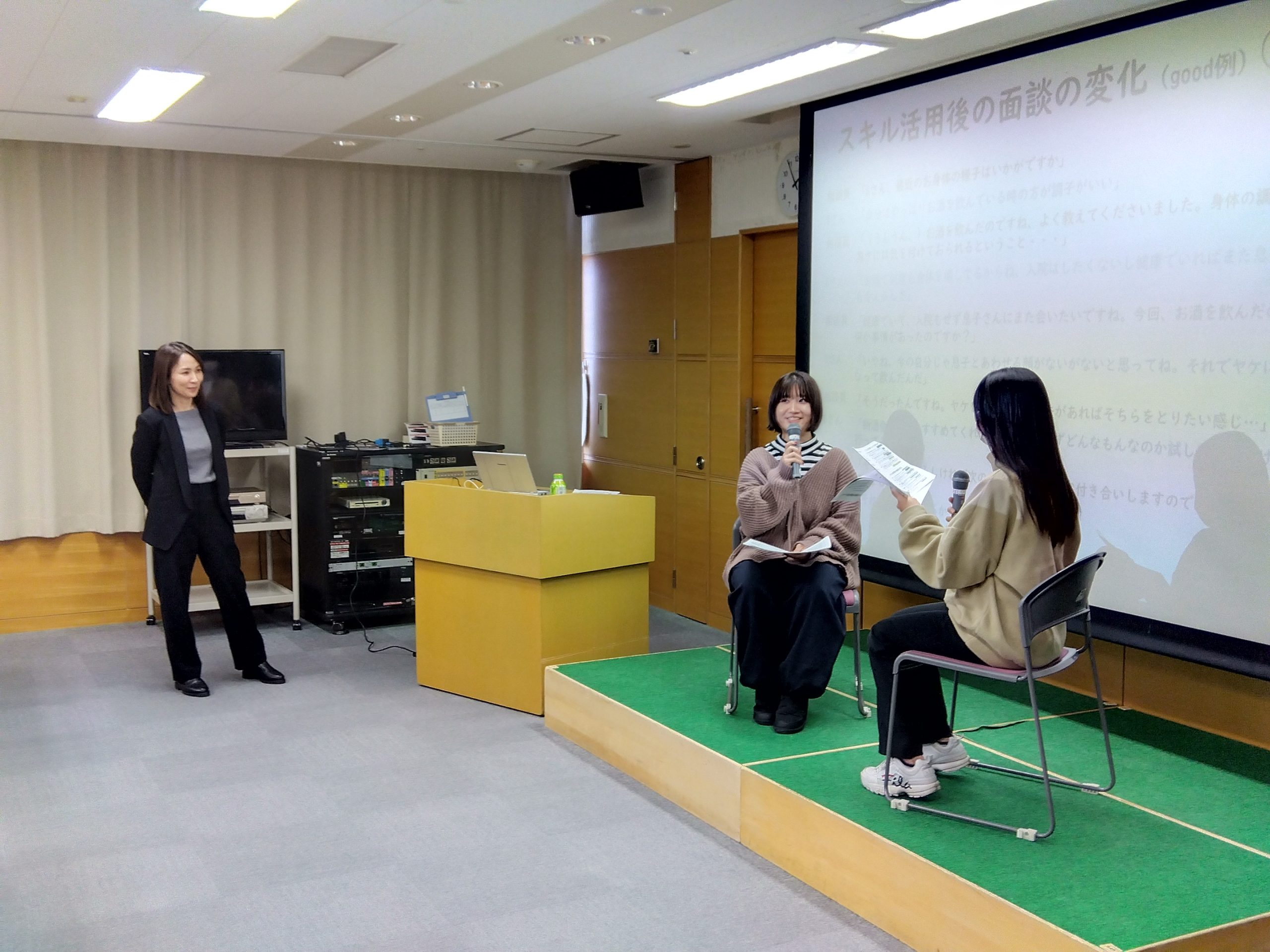 当日は旭川市立大学五所ゼミの学生さんのロールプレイを盛り込みながらの講義だったこともあり、具体的な面談場面がイメージしやすくわかりやすかったと大変好評でした。また、2人1組になり、「相談員役」「クライアント役」を交代しながら演習も行いましたが、緊張や難しさを感じながらも皆さん積極的に取り組まれていました。