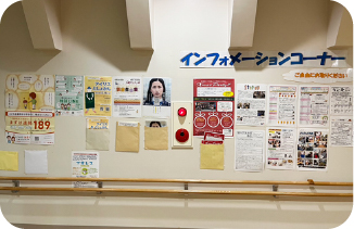 センター内にインフォメーションコーナーを設け、地域の社会資源や事業所のパンフレット等による情報提供。