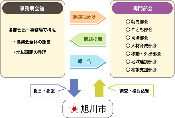 - 各部会長と事務局で構成。協議会全体の運営に関する事や、各部会の活動内容の共有、部会や関係機関から抽出された地域課題の整理等を行う。